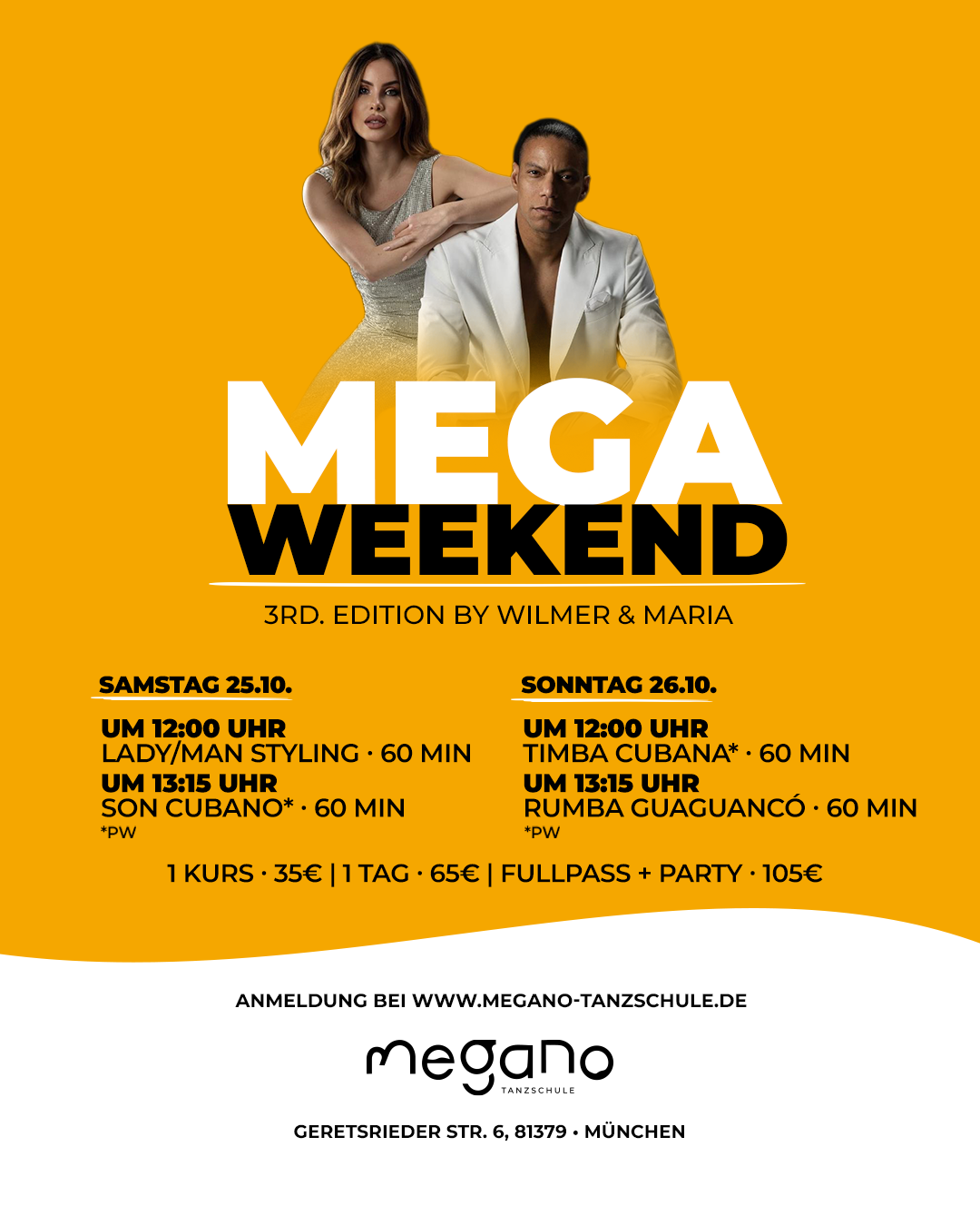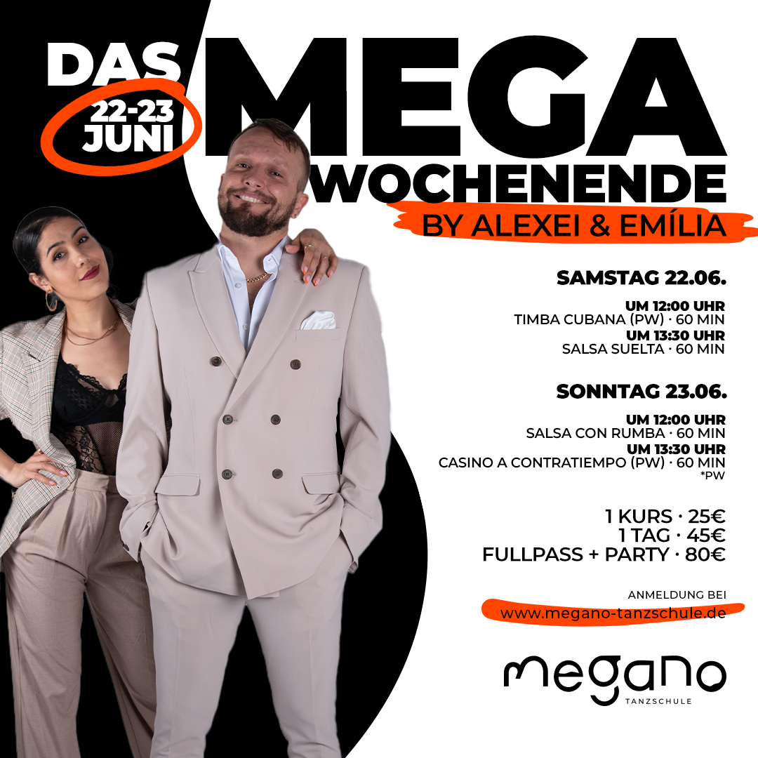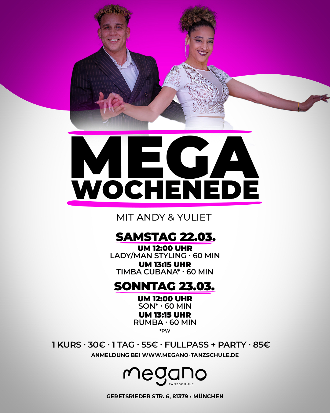 Hey Leute! Freut euch auf ein Mega-Wochenende mit Andy und Yuliet, einem super talentierten kubanischen Tanzpaar, bekannt für ihre Energie und Professionalität in der internationalen Salsa-Szene. Zum ersten Mal in München, präsentiert von der Megano Tanzschule, bringen sie uns ihre Leidenschaft und ansteckende Lebensfreude direkt in unsere Tanzschule. Verpasst nicht die Chance, mit den Besten der kubanischen Salsa zu tanzen und eine unvergessliche Zeit zu erleben.