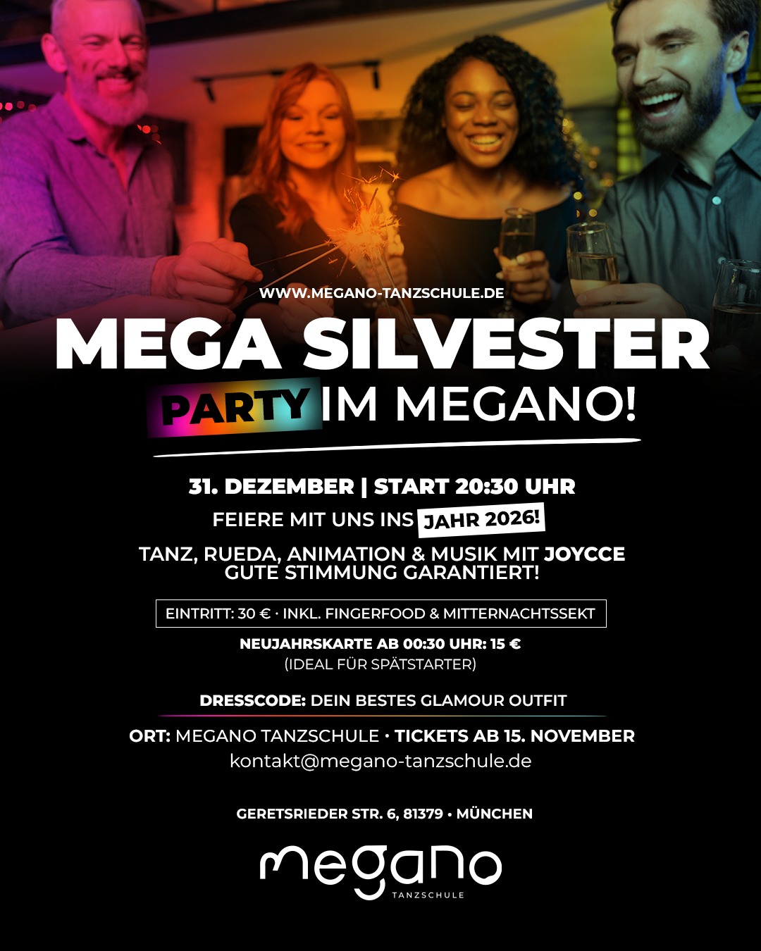 Am 31. Dezember lädt das Megano zur großen Mega Silvester Party ein! Feiere mit uns den Countdown ins neue Jahr. Genieße einen unvergesslichen Abend mit Musik, Tanz, Rueda, Animation und vielen großartigen Menschen.